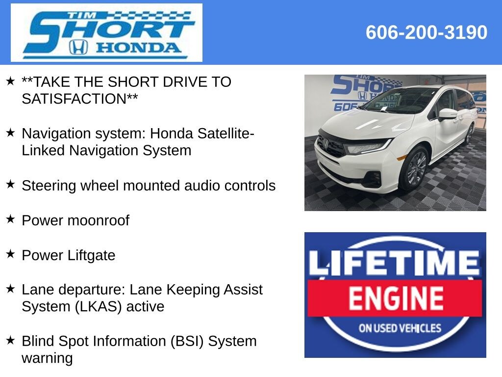 Powered by a robust 3.5L V6 SOHC i-VTEC 24V engine paired with a smooth-shifting 10-Speed Automatic transmission, the Odyssey Touring delivers an exceptional blend of performance and efficiency, with an impressive 19 city and 28 highway MPG. Indulge in the convenience of a power liftgate, the security of Blind Spot Information, and the comfort of heated leather-trimmed seats, all while staying connected with the intuitive Honda Satellite-Linked Navigation System and seamless smartphone integration.