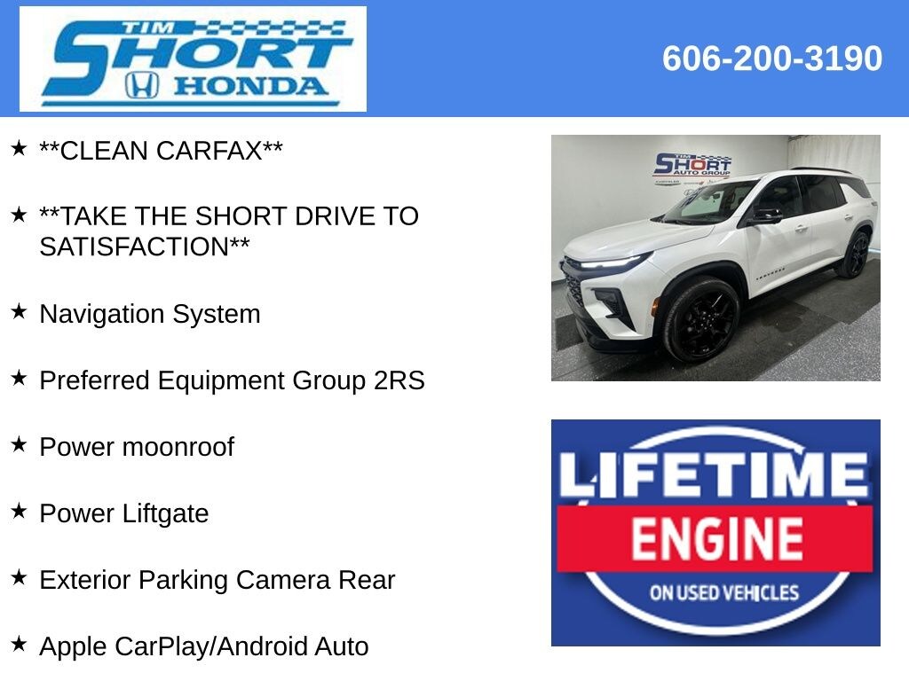 Take the Short Drive to Satisfaction to Tim Short Honda Ivel, Ky. Tim Short Honda is excited to offer this stunning 2024 Chevrolet Traverse in Iridescent Pearl Tricoat This vehicle has passed our comprehensive inspection and comes with the following features;