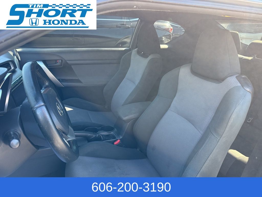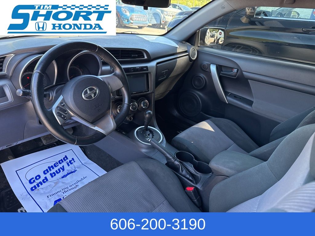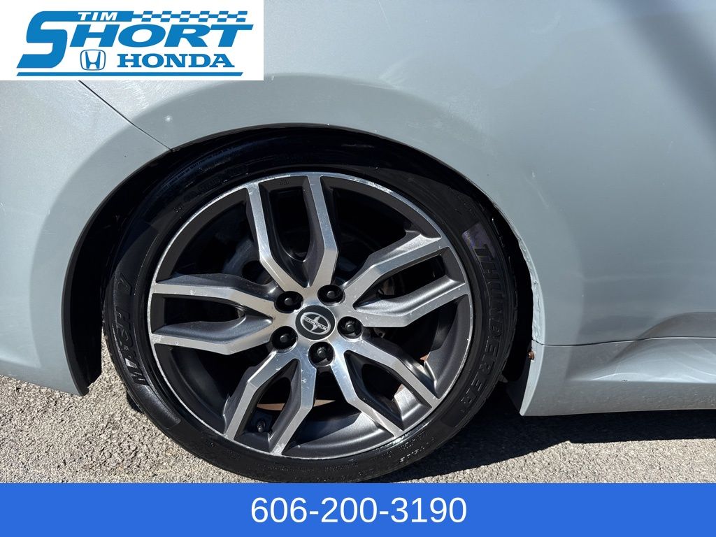 - **Checked Features**: 8 Speakers, AM/FM radio, CD player, Premium audio system: Pioneer, Radio data system, Radio: Scion Standard Audio, Air Conditioning, Rear window defroster, Power steering, Power windows, Remote keyless entry, Steering wheel mounted audio controls, Speed control, Brake assist, Electronic Stability Control, Four wheel independent suspension, Traction control, Bumpers: body-color, Power door mirrors, Turn signal indicator mirrors, Driver door bin, Driver vanity mirror, Front reading lights, Illuminated entry, Outside temperature display, Passenger vanity mirror, Tachometer, Telescoping steering wheel, Tilt steering wheel, 4-Wheel Disc Brakes, ABS brakes, Anti-whiplash front head restraints, Dual front impact airbags, Dual front side impact airbags, Front anti-roll bar, Knee airbag, Low tire pressure warning, Occupant sensing airbag, Overhead airbag, Rear anti-roll bar, Fabric Upholstery, Front Bucket Seats, Front Center Armrest, Front Sport Bucket Seats, Split folding rear seat, Panic alarm, Passenger door bin, Power moonroof, 18" x 7.5" Aluminum Alloy Wheels, Alloy wheels, Variably intermittent wipers