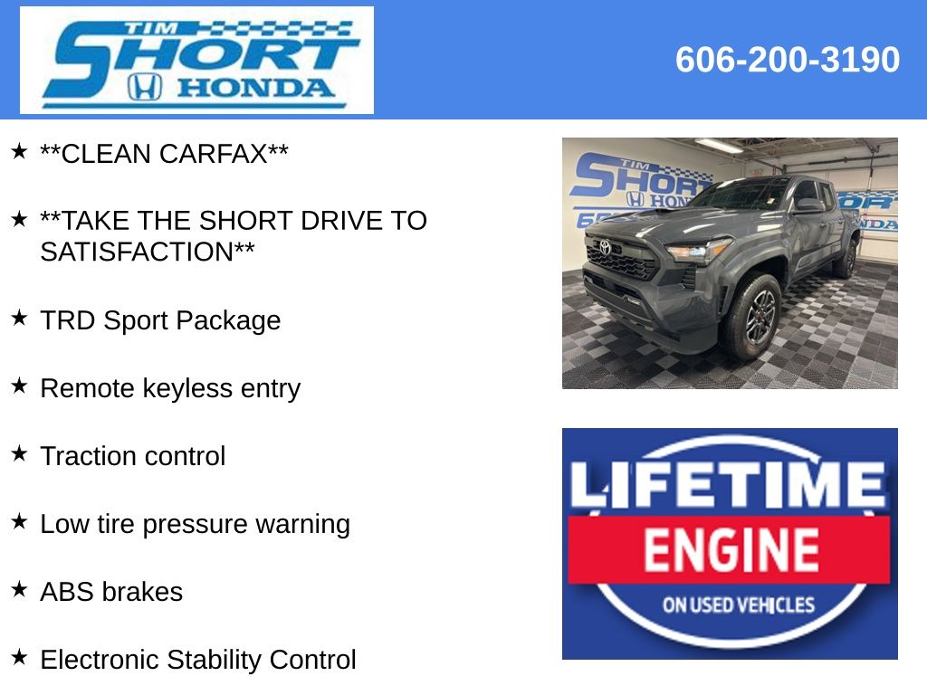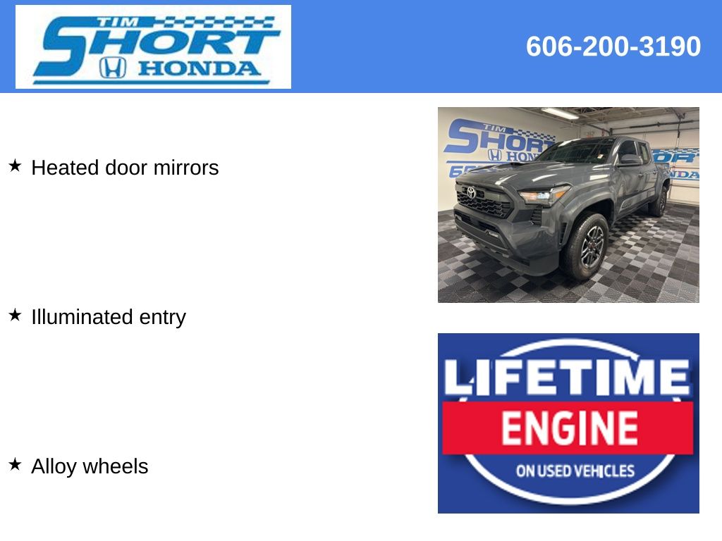 Take the Short Drive to Satisfaction to Tim Short Honda Ivel, Ky. Tim Short Honda is excited to offer this robust, reliable 2025 Toyota Tacoma in Black This vehicle has passed our comprehensive inspection and comes with the following features;